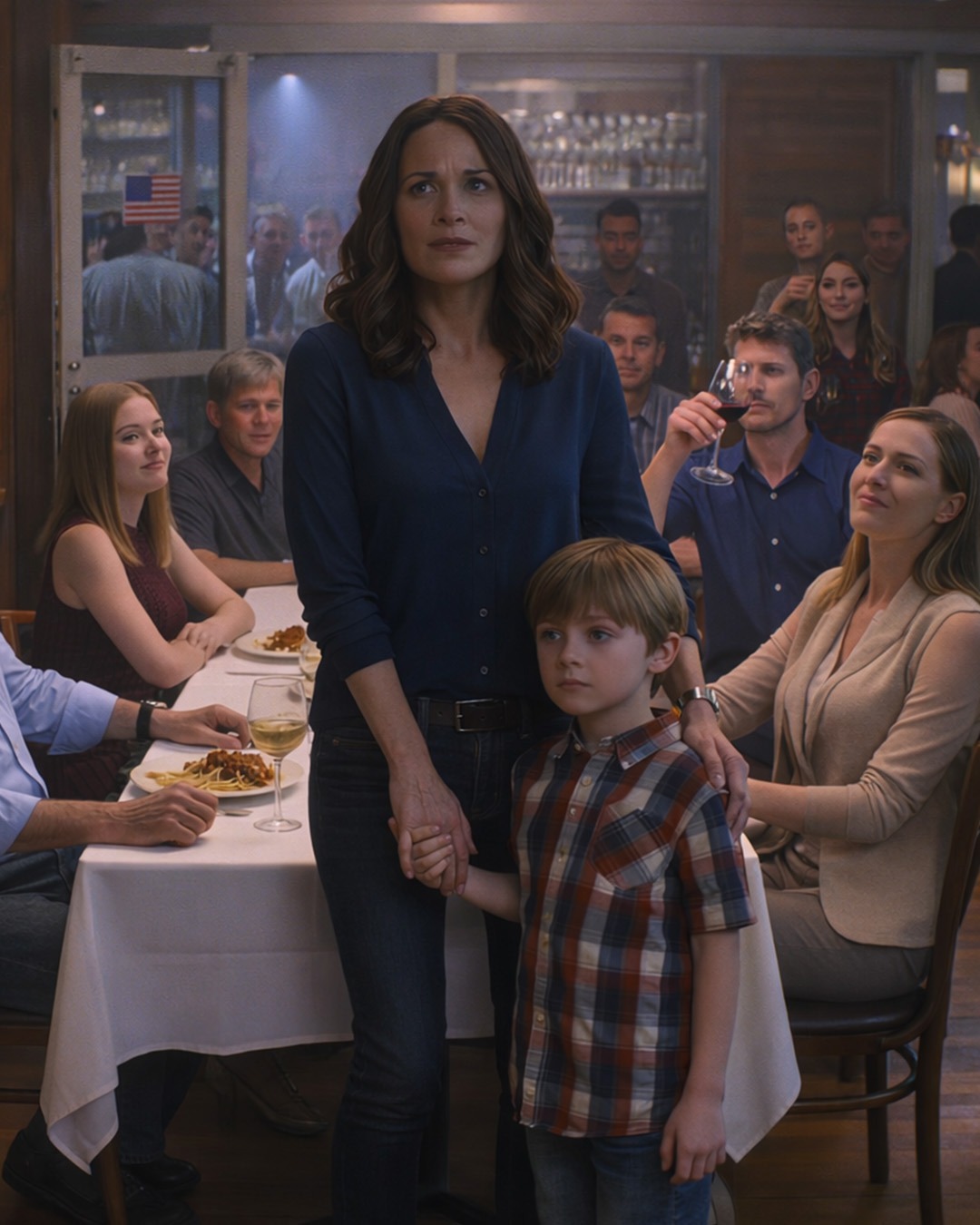 A nuestro alrededor, las copas de vino de cristal reflejaban la luz de las velas. Manteles blancos se extendían sobre nuestra sección reservada. Mi hijo Carter, de solo siete años, estaba sentado a mi lado con sus tiras de pollo a medio comer.