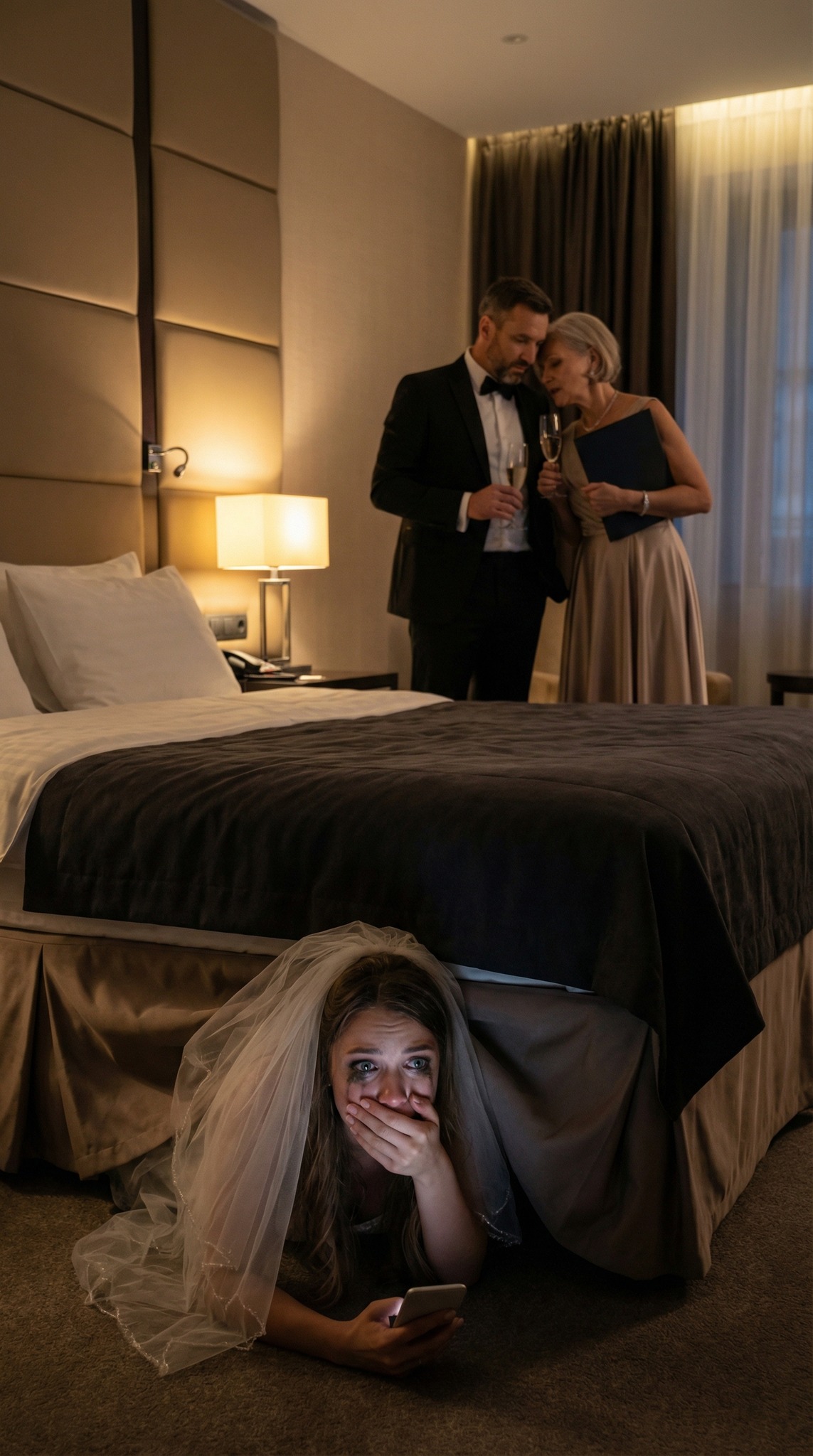 Esa noche, cuando el último invitado se marchó y el hotel quedó en silencio, me permití un capricho. Me llamo Lucía Navarro, tenía veintiocho años y acababa de casarme con Álvaro Ríos, el hombre que —según todos— me había “salvado” de una vida de alquileres caros y trabajos temporales. Con el velo aún enganchado en el moño, me agaché riéndome y me deslicé bajo la cama de la suite nupcial. Era mi broma tonta de despedida: asustarlo un poco, una última travesura antes de “ser esposa” en serio.